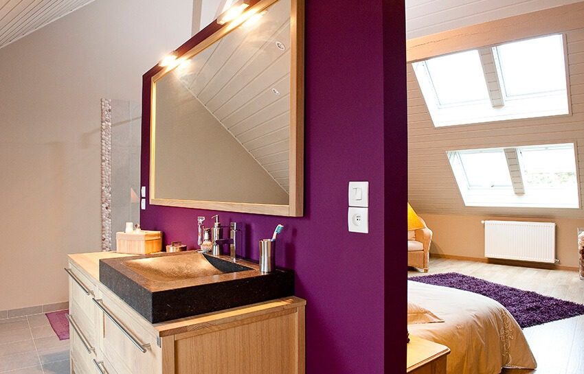 Dans cette nouvelle chambre lumineuse, une cloison pourpre délimite l’espace nuit et la salle d’eau en apportant du caractère à la pièce.